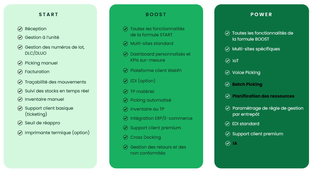 Pour s'adapter aux besoins d'un entrepôt selon sa taille, et ses besoins de gestion, nous avons défini plusieurs niveaux de formules commerciales, d'ampleur et périmètre différents: