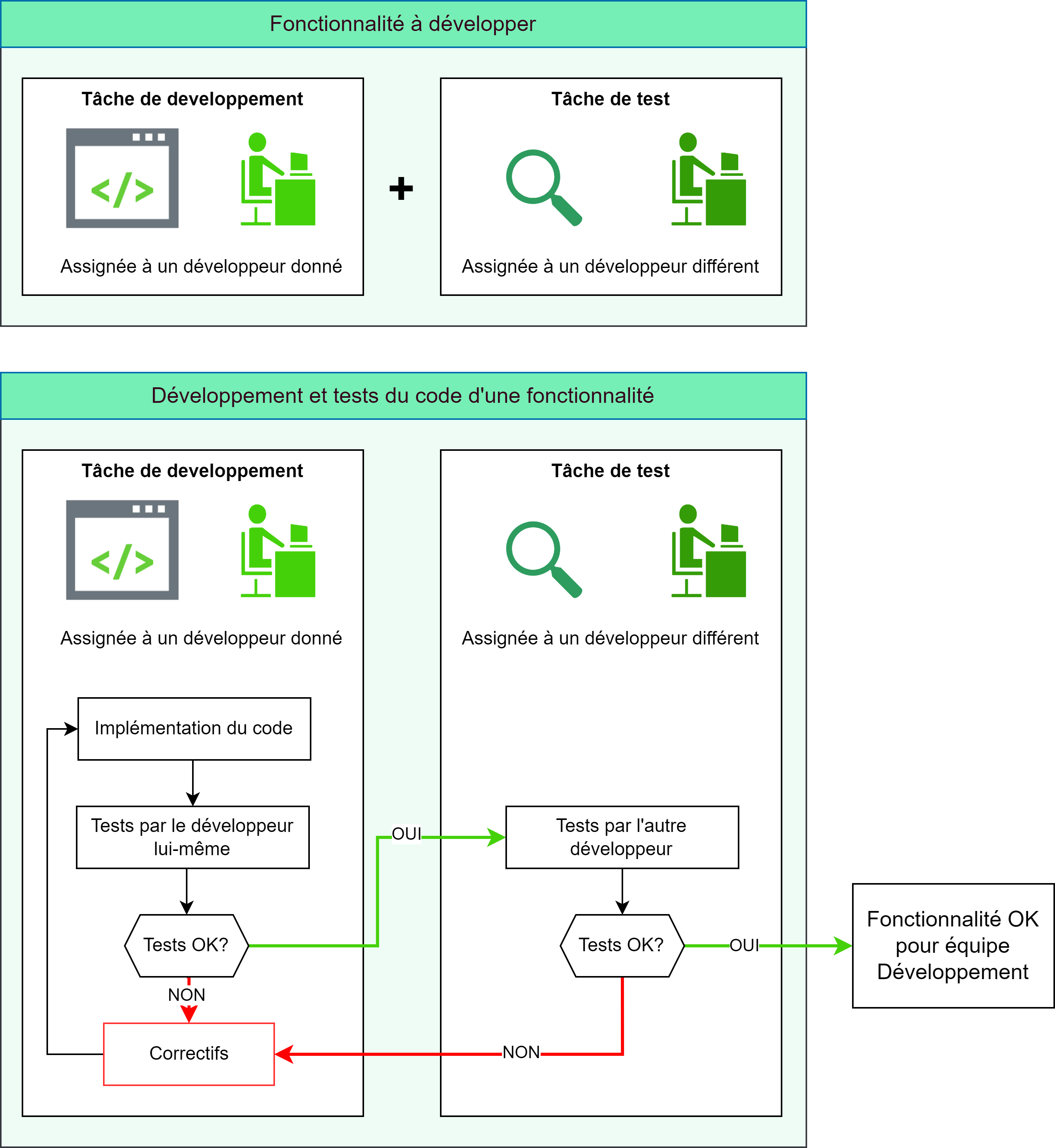 - La tâche de tests est affectée à un développeur autre que l'auteur du code, afin que le test ne soit pas effectué par la personne qui a développé, mais par un collègue au regard neuf.