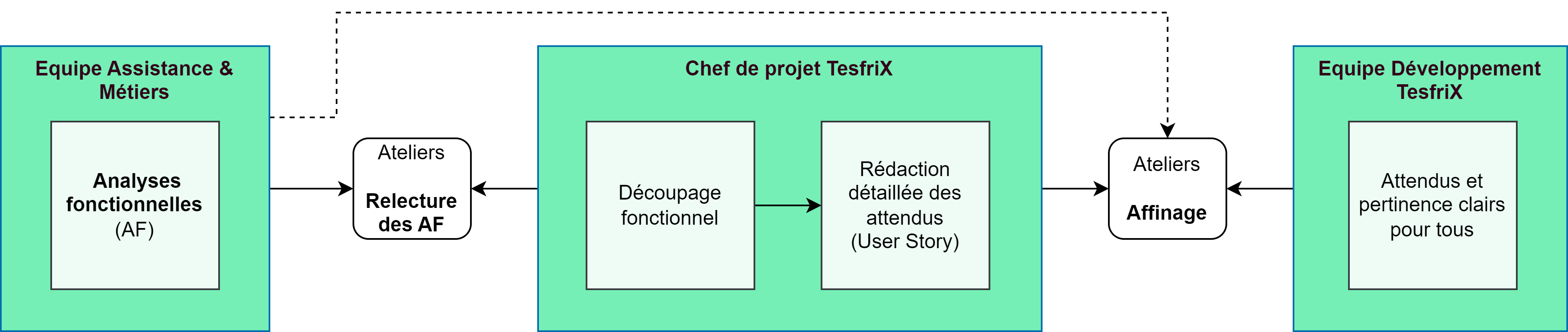 Le chef de projet TesfriX procède alors au découpage fonctionnel puis à la rédaction des attendus détaillés (User Story), à l'intention des développeurs