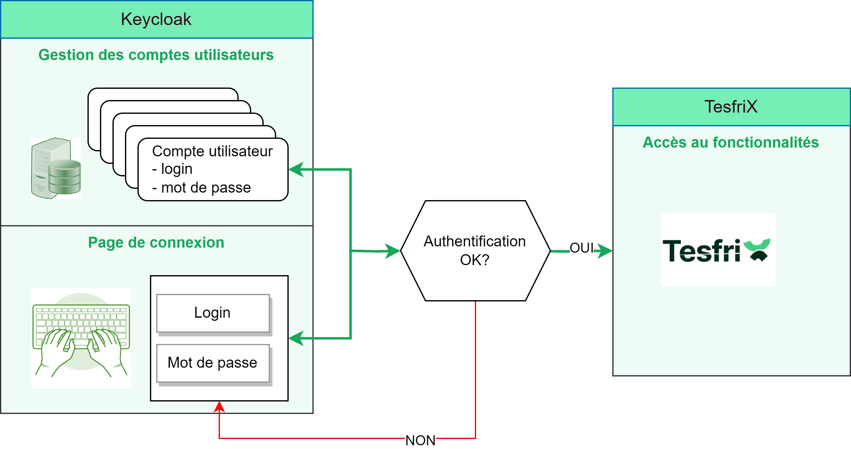 Keycloak gère l'authentification et l'accès à TesfriX